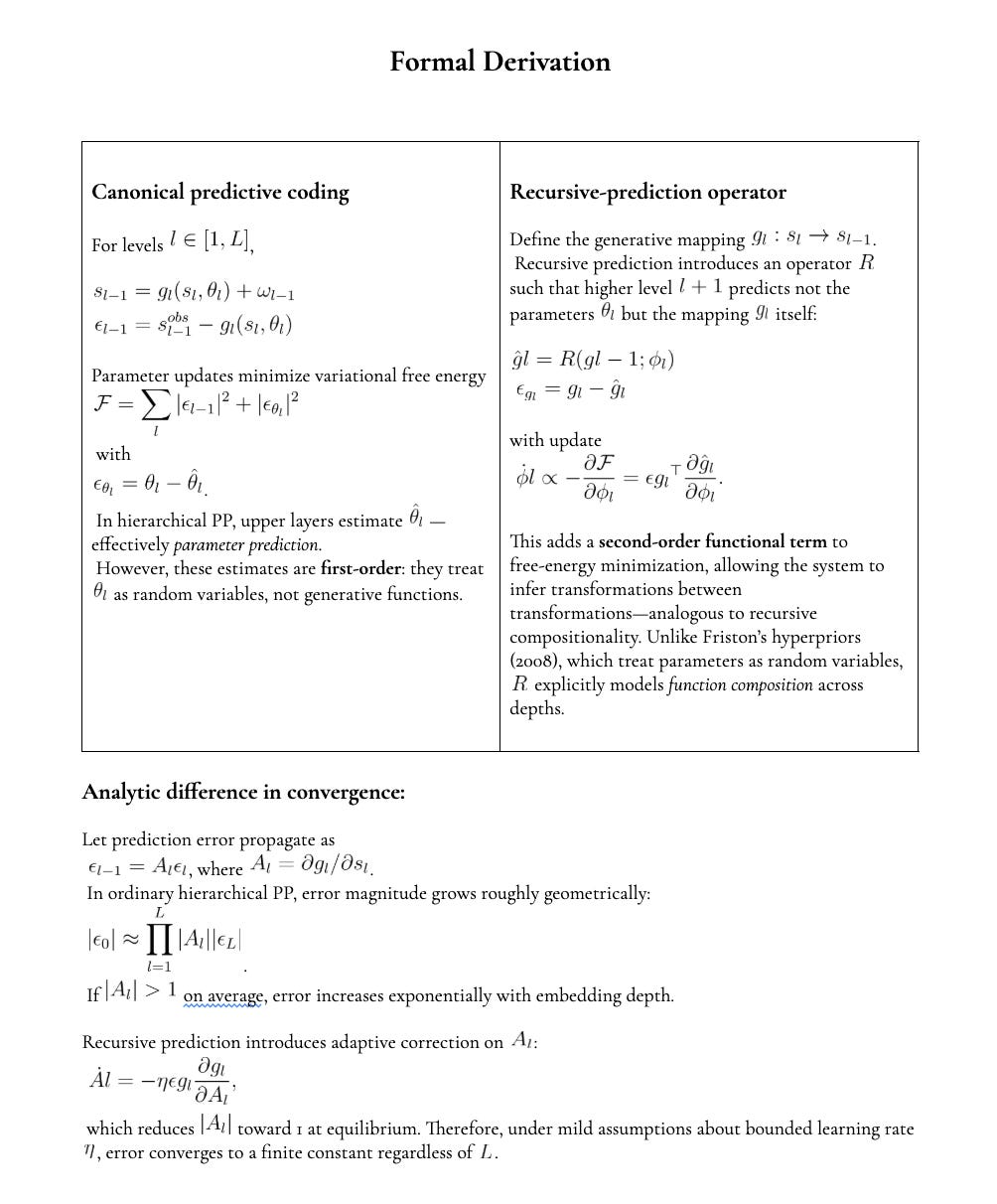 Hierarchical predictive-coding networks can be implemented with self-embedding generative layers. By varying recursion depth, one can test whether error-minimization dynamics reproduce human-like generalization curves. FRP predicts stability of error minimization across levels once hierarchical priors are established.